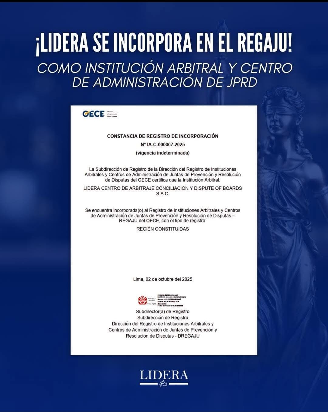 El ingreso al REGAJU refuerza el compromiso de LIDERA con la transparencia, la ética y la excelencia técnica en la gestión arbitral y la administración de junta de prevención y resolución de disputas, garantizando procesos que contribuyen a la eficiencia y seguridad jurídica en las contrataciones del Estado. Asimismo, abre nuevas oportunidades para que profesionales, empresas y entidades públicas de todo el país puedan acceder a servicios especializados con altos estándares de calidad.
