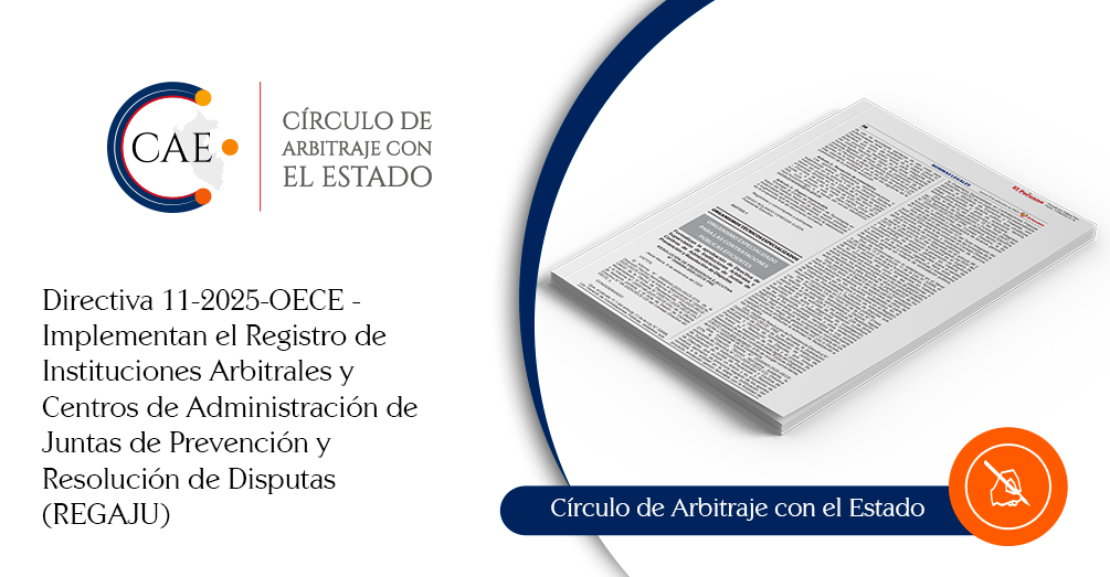 Directiva 11-2025-OECE - Implementan el Registro de Instituciones Arbitrales y Centros de Administración de Juntas de Prevención y Resolución de Disputas (REGAJU) Posteado el 12 de Setiembre, 2025 CAE DALE CLIC AQUÍ PARA DESCARGAR EL PDF Categoria Leer, más sobre: Noticias Comparte esto: Facebook