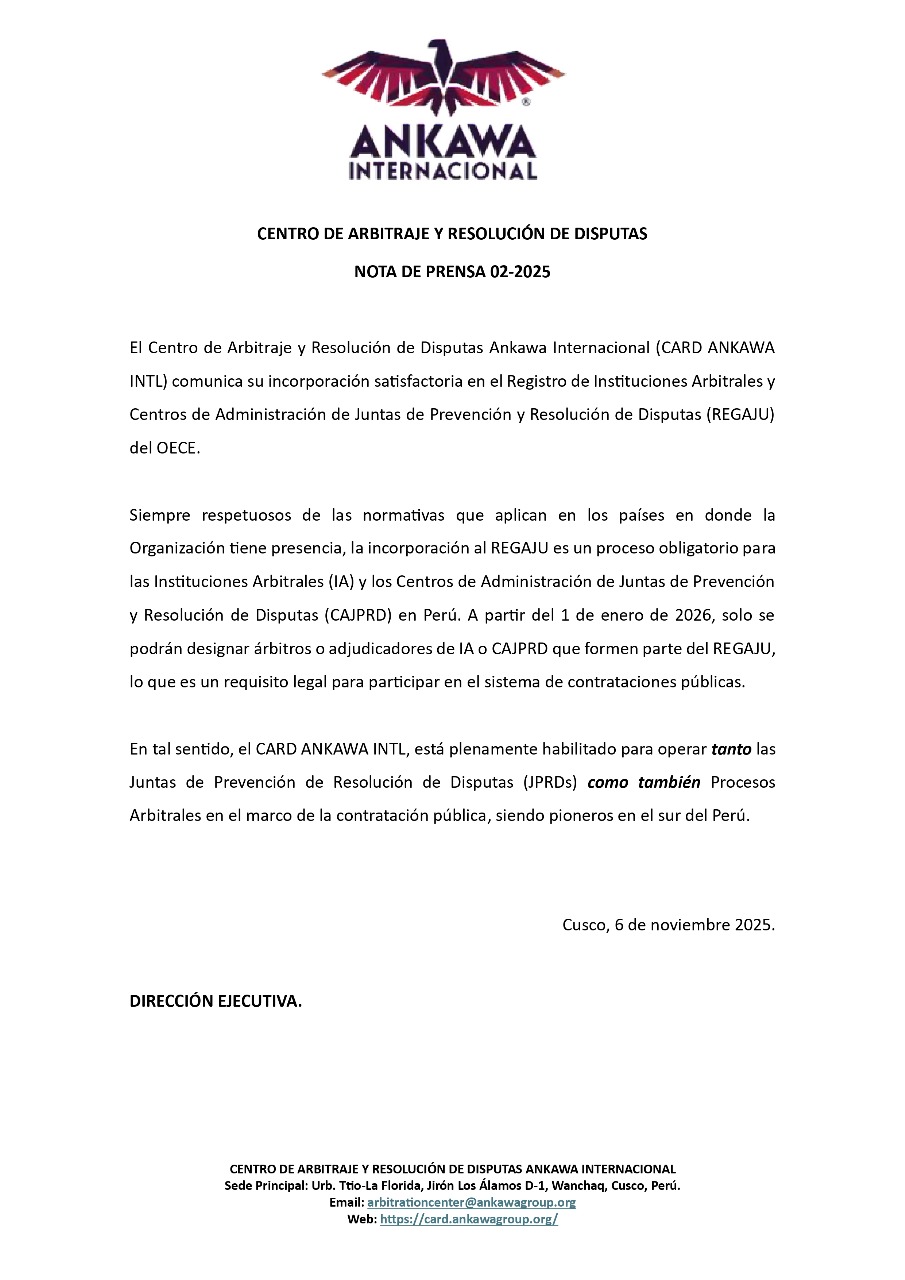 En tal sentido, el CARD ANKAWA INTL, está plenamente habilitado para operar tanto las Juntas de Prevención de Resolución de Disputas (JPRDs) como también Procesos Arbitrales en el marco de la contratación pública. Continuando como pioneros en el sur del Perú.