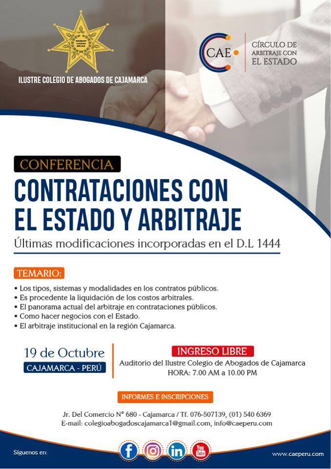 Conferencia de Contratación con el Estado y Arbitraje – Cajamarca Posteado el 19 de Octubre, 2018 CAE Categoria Leer, más sobre: Seminarios Comparte esto: Facebook