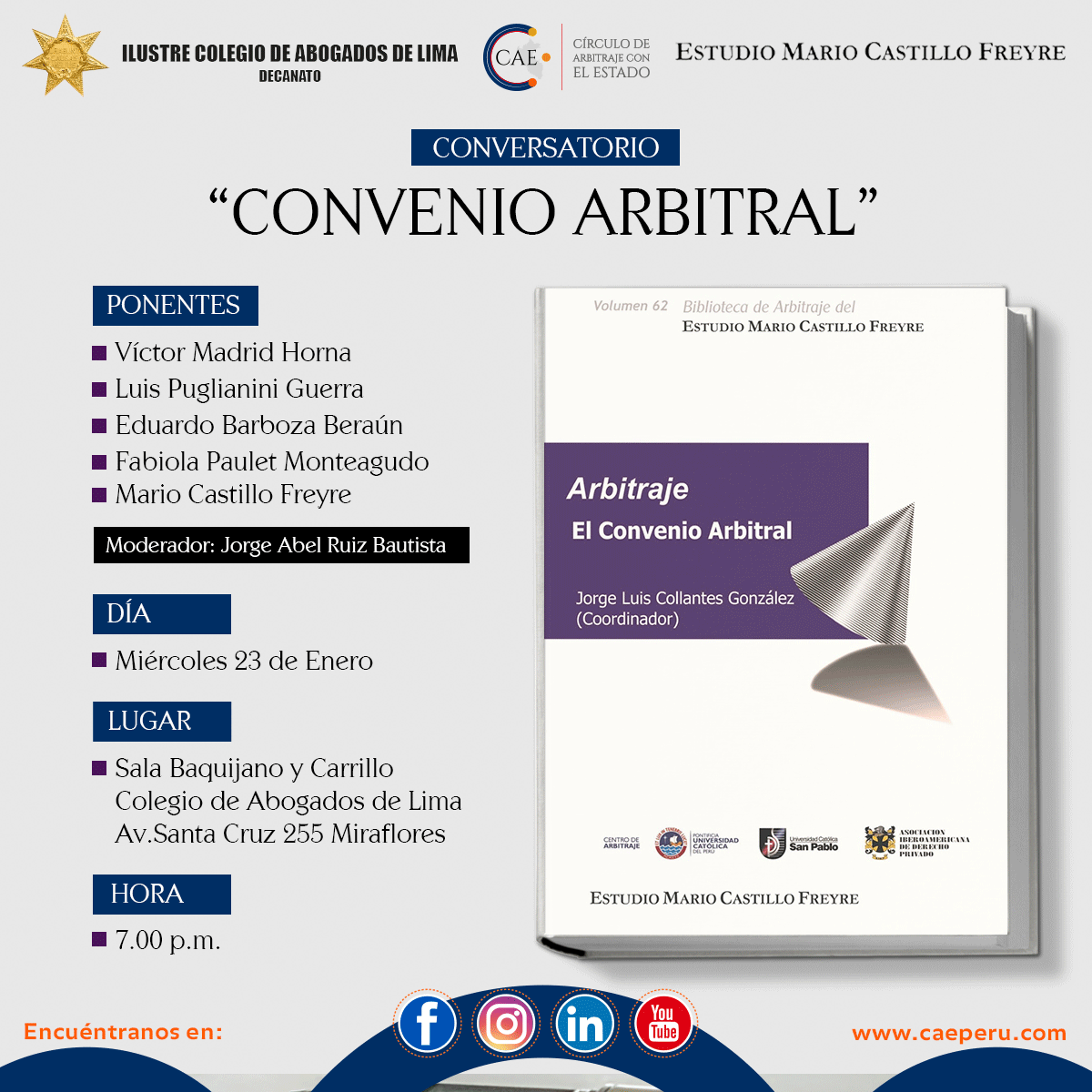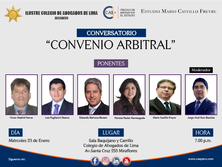 Conversatorio sobre el Convenio Arbitral Posteado el 23 de Enero, 2019 CAE Categoria Leer, más sobre: Seminarios Comparte esto: Facebook