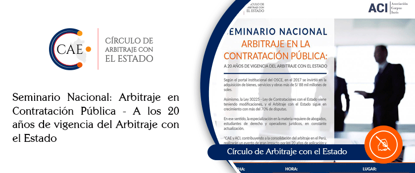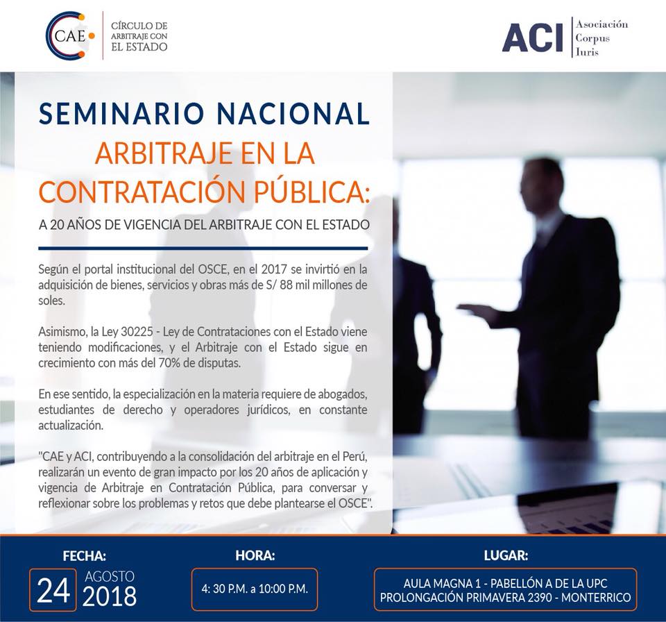 Seminario Nacional: Arbitraje en Contratación Pública - A los 20 años de vigencia del Arbitraje con el Estado Posteado el 24 de Agosto, 2018 CAE Categoria Leer, más sobre: Seminarios Comparte esto: Facebook