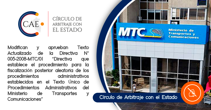Seguir LeyendoModifican y aprueban Texto Actualizado de la Directiva N° 005-2008-MTC/01 “Directiva que establece el procedimiento para la fiscalización posterior aleatoria de los procedimientos administrativos establecidos en el Texto Único de Procedimientos Administrativos del Ministerio de Transportes y Comunicaciones”