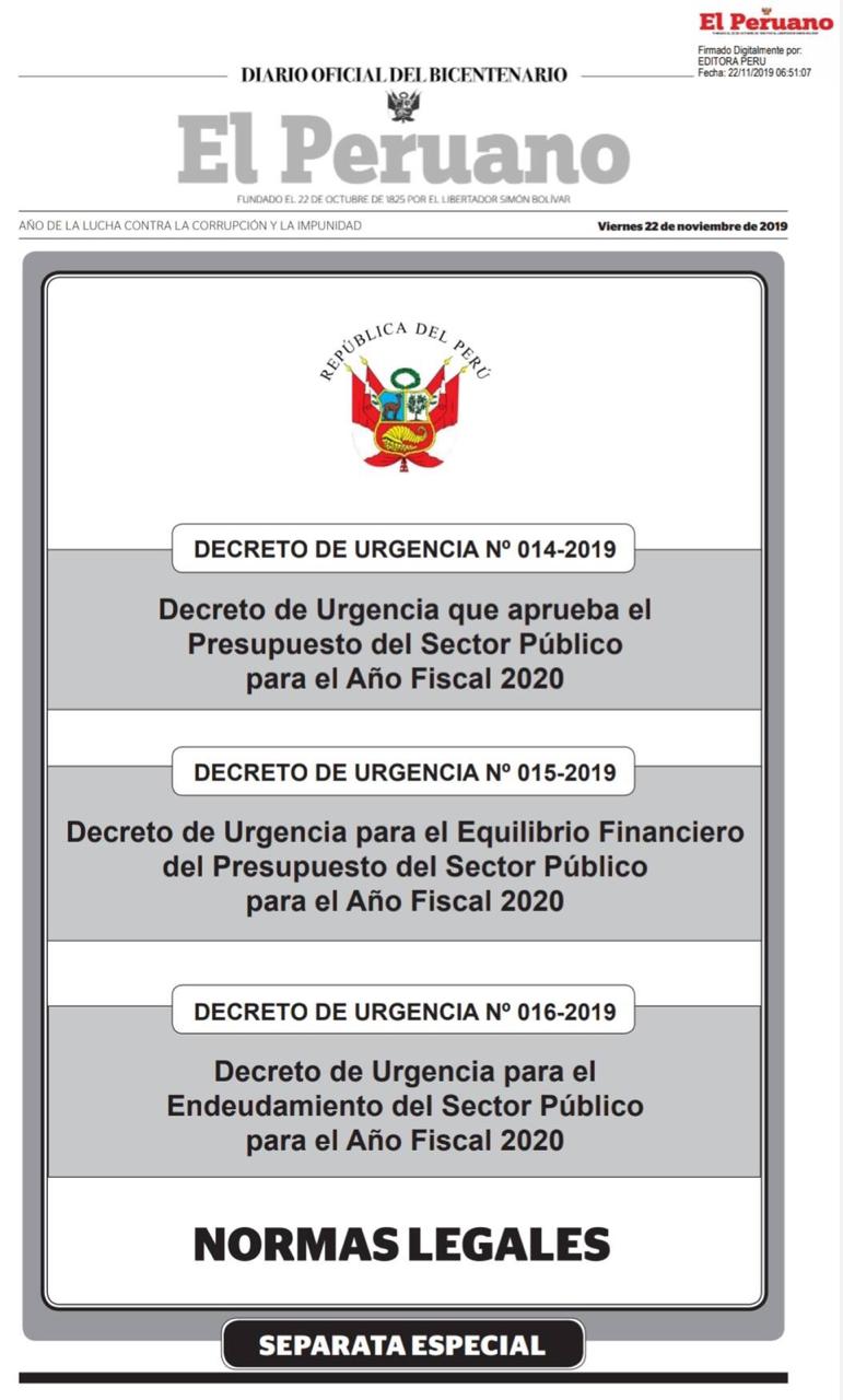 Decretos de Urgencia en Materia Presupuestal Posteado el 22 de Noviembre, 2019 CAE REVÍSALOS EN EL SIGUIENTE ENLACE Categoria Leer, más sobre: Noticias Comparte esto: Facebook