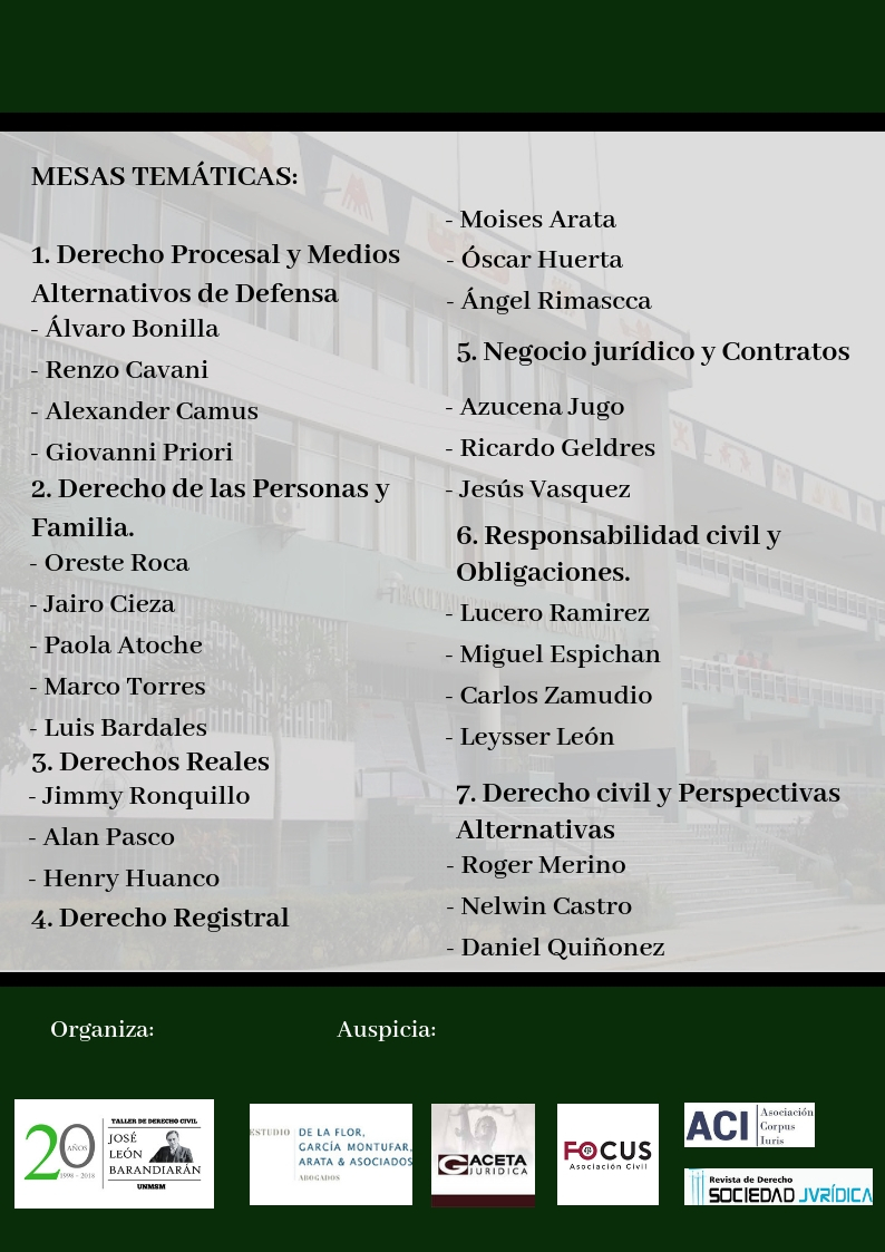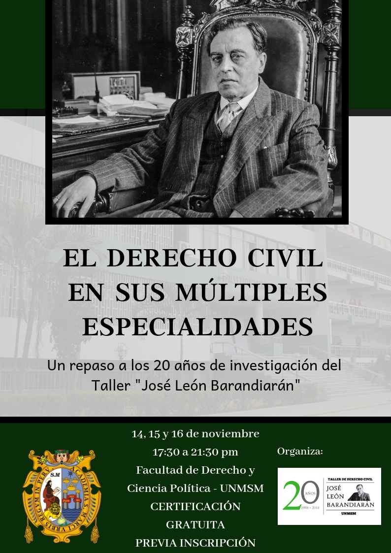 Con ocasión del vigésimo aniversario de existencia institucional del Taller de Derecho Civil “José León Barandiarán” de la Facultad de Derecho y Ciencia Política de la Universidad Nacional Mayor de San Marcos, se desarrollará el evento conmemorativo titulado “El Derecho Civil en sus múltiples especialidades” Un repaso por los 20 años de investigación del Taller de Derecho Civil “José León Barandiarán”.