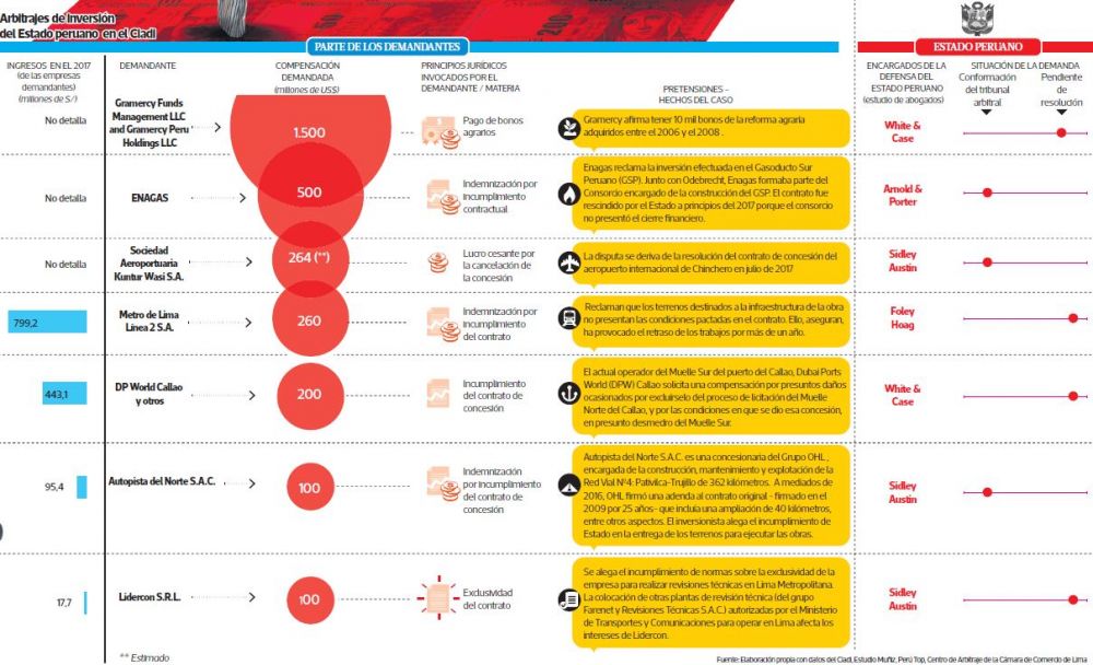 El Estado peruano enfrenta demandas de empresas privadas ante el Centro Internacional de Arreglo de Diferencias Relativas a Inversiones (CIADI) por unos US$1.500 millones, sin contar los US$1.500 millones exigidos por un fondo acreedor de bonos agrarios, un caso histórico que aún no encuentra cauce. Y sin incluir tampoco los litigios potenciales, en proceso de presentación y evaluación, que sumarían no menos de US$1.500 millones.