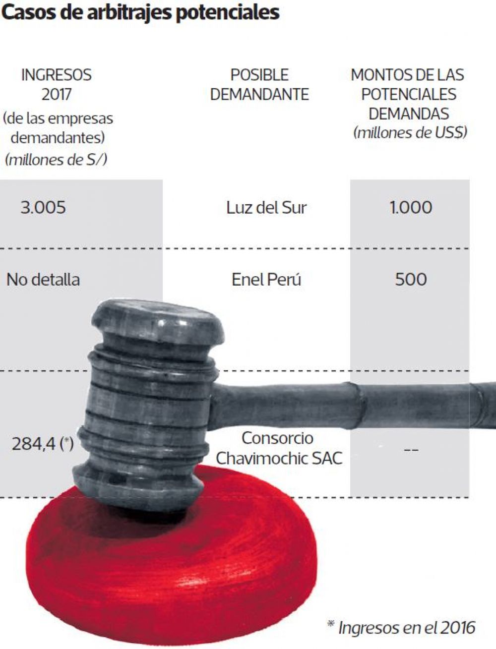A estas demandas latentes, se sumarían las de las distribuidoras eléctricas Enel, Luz del Sur y Electrodunas, proveedoras de dicho servicio en El Callao, Lima e Ica, respectivamente, según supo Día1. Fuentes del sector informaron que evalúan presentar una solicitud al CIADI por no menos de US$1.500 millones por el impacto que la reciente rebaja de tarifas tendrá en sus utilidades en los próximos cuatro años.