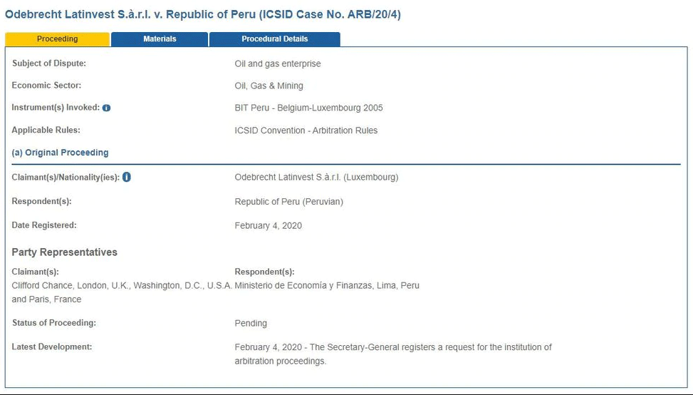En la actualidad, Odebrecht solo tiene un caso ingresado en el CIADI que, justamente, es contra el Perú. El mismo se encuentra pendiente a ser aprobado por dicho centro.